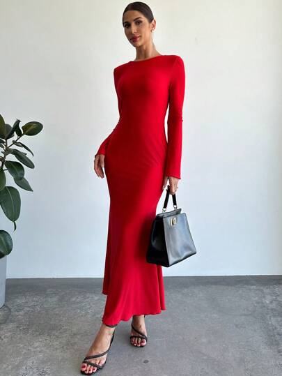 Firerie Women Elegant Solid Color Mermaid Long Dress, Autumn - Red - View 1