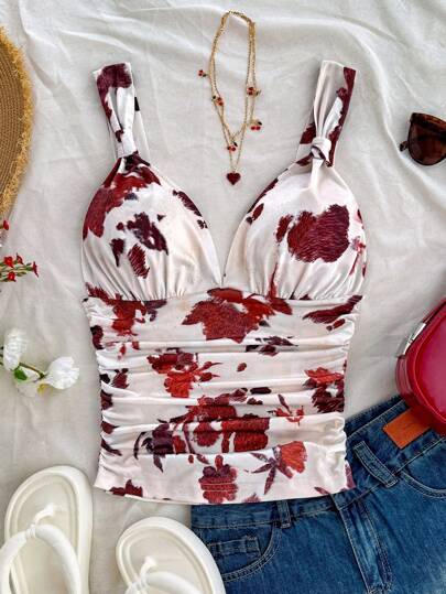 Soleia Women's Cow Print Tie Knot V-Neck Ruched Summer Top,Summer Tops - Khaki - View 1