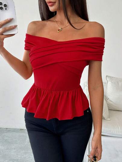 Chiquease Women Off Shoulder Solid Minimalist Crisscross Hem Ruffle T-Shirt - Red - View 1