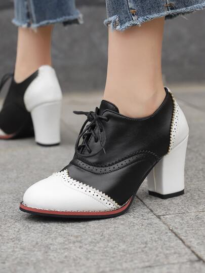 Women Wingtip Detail Lace Up Two Tone Pumps, Chunky Heeled Elegant Oxford Shoes White And Black - Black and White - View 1