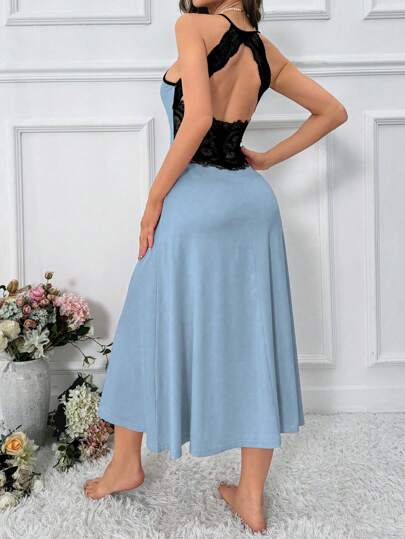 Women's Lace Splice Backless Sleepwear Dress - Baby Blue - View 1