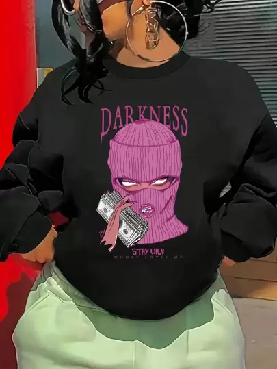 SHEIN EZwear Women's Round Neck Fleece Sweatshirt With Letter And Character Print - Black - View 1