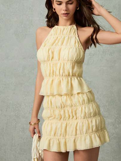 Poéselle Women Solid Color Ruffle Collar Top And Mini Skirt Fashion 2 Pieces Set, Cream Yellow Backless Suit - Apricot - View 1
