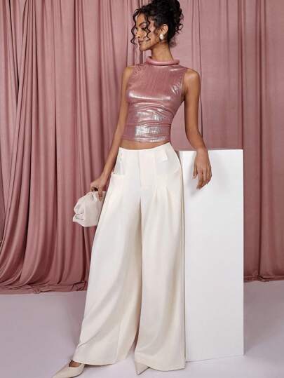 COSMINA Women Solid Color Stand Collar Sleeveless Slim Casual Tank Top - Pink - View 1