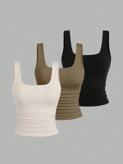 Sweetra Women Square Neck Pleated Fitted Tank Top - Multicolor - View 1