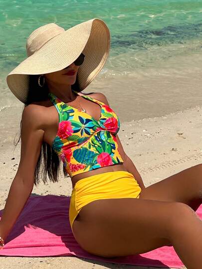 Floral Print Halter High Waisted Tankini Summer Beach - Multicolor - View 1