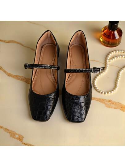 Women's Black Crocodile Patent Square Toe Pumps - Black - View 1