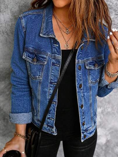 Women's Blue Button Front Pocket Detail Denim Jacket Casual Street Spring - Blue - View 1