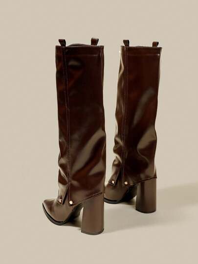 Women's Brown Pointed Toe Knee-High Boots, Comfortable Fitted Shaft Boots, Versatile Fashion Boots, Slip-On Wide Leg Boots, Chunky Heel Pleated Fold-Over Boots - Brown - View 1