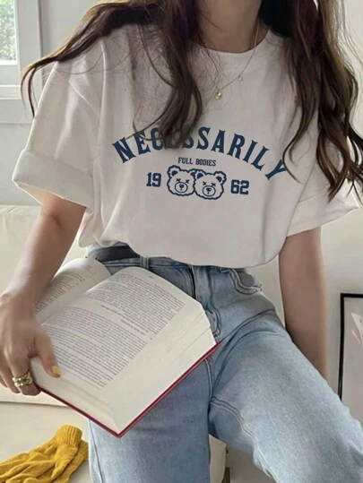 Women's Casual Round Neck Letter & Cartoon Print Dropped Shoulder T-Shirt - White - View 1