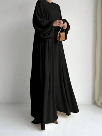 Women's Casual Solid Color Lantern Sleeve Long Arabian Modest Dress For Autumn - Black - View 1