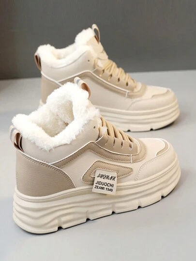 Women's Winter High-Top Sneakers - Thick Thermal Lined , Anti-Slip Thick Sole, Fashionable Geometric Pattern Design, Lace-Up Closure - Khaki - View 1
