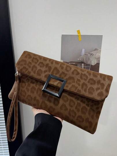 Túi cầm tay nữ, túi vuông nhỏ họa tiết da báo thời trang, túi xách có nắp gập.