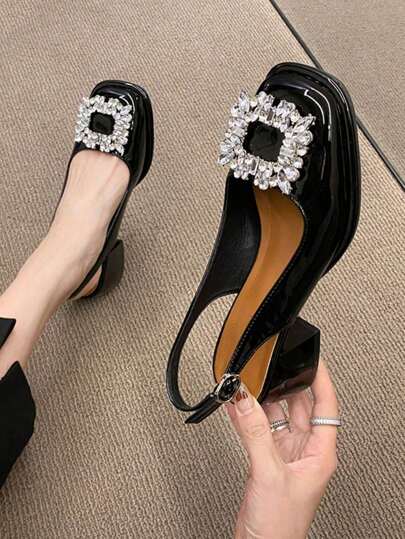 Women's Diamond-Encrusted Fashion Square Toe High Heel Slip-On Shoes - Black - View 1