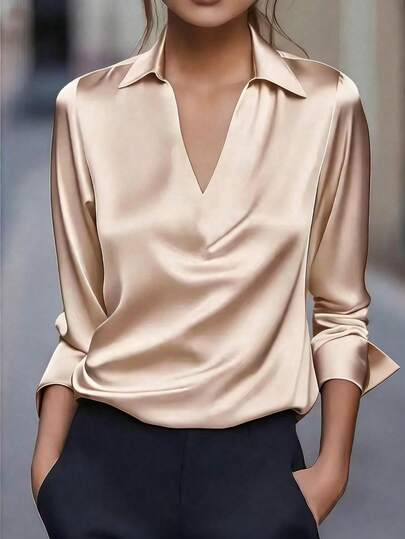 Women's Elegant Champagne Satin V-Neck Blouse - Sophisticated High-End Top, Classic Shirt, Opaque Satin Fabric, Easy Care, Suitable For Business, Formal Occasions, And Casual Social Events, Spring/Summer/Autumn - Champagne - View 1