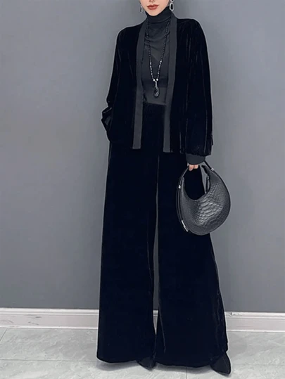 Women's Elegant, Practical, Minimalist Long Sleeve Collarless Top And Wide Leg Pants Set, Autumn/Winter - Black - View 1