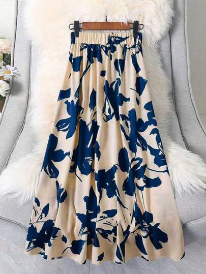Women's Floral Print Elastic Waist Maxi Skirt, Casual Holiday Style - Apricot Base With Blue Flowers - View 1