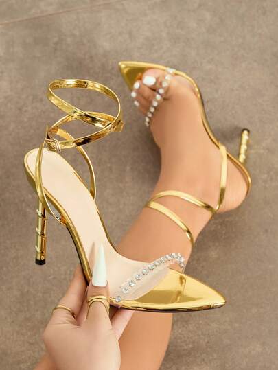 Women's High Heel Shoes, Fashionable And Elegant For Parties, Outdoor Events, And Formal Occasions. Features Unique Spiral Design, Sparkling Rhinestones, PVC Transparent Strap, Adjustable Ankle Strap, Soft Metallic Textured Material, Sexy And Glamorous Gold Color. Suitable For Dresses, Gowns, And Formal Events. - Gold - View 1