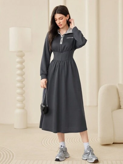 Của phụ nữ Thêu Chữ Vá lại Collared Cao eo Đầm