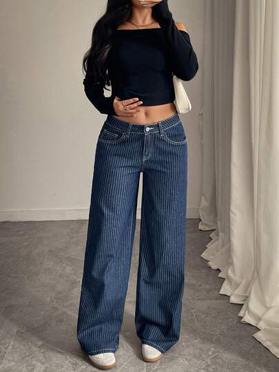 Women's Long Striped Wide Leg Jeans, Casual Style With Buttons, Zipper And Pockets, Non-Stretch, Comfortable And Breathable - Dark Wash - View 1
