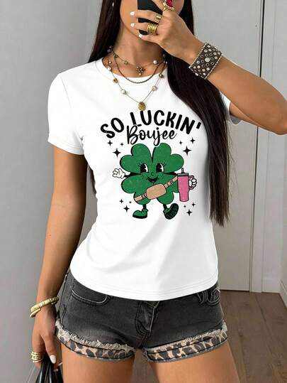 Women's Lucky Clover Print Casual Round Neck Short Sleeve T-Shirt, Comfortable For Daily Wear, Suitable For St. Patrick's Day, Summer, White Top - White - View 1