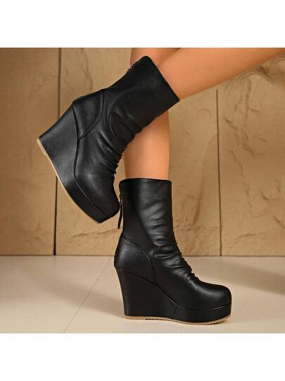 Women's Mid-Calf Boots, Flat Wedge Heel, Fashion & Comfortable, Autumn/Winter - Black - View 1