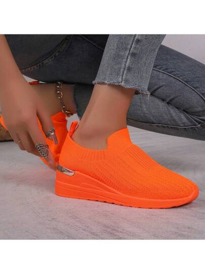 Women's New Personalized Platform Thick Bottom Knitted Shoes, Solid Color, Lightweight, Durable, Breathable, Casual Sneakers, European And American Style, Simple Round Toe, Elastic, Slip-On, Anti-Slip, Heighten Platform, Suitable For All Seasons, Sports Walking Casual Shoes, Orange Color - Burnt Orange - View 1