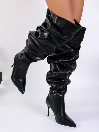 Women's Over-the-knee High Boots With Pointed Toe, Stiletto Heel, Wide Calf And Creased Detail - Black - View 1