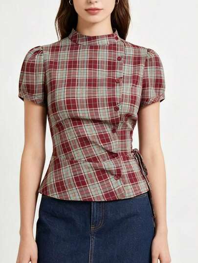 Áo kiểu nữ mùa hè, cổ kẻ caro, tay phồng, buộc dây, cài cúc phía trước.