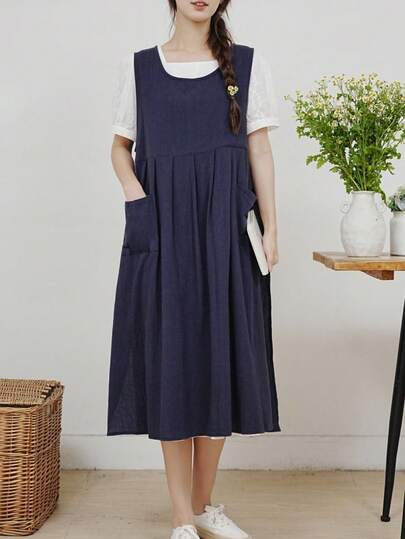 Women's Plus Size Navy Blue One-Piece Drawstring Apron With Pockets, Cute & Modern Style Side Slit Pleated Stain-Resistant Smock, Versatile For Multiple Occasions, Available In Thin & Thick Options - Dark Blue - View 1