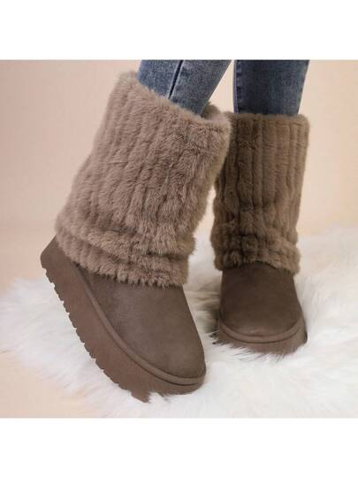 Women's Plus Size New Warm Snow Boots Mid-Calf Boots, Thick Wedge Heel Anti-Slip Snow Boots, Thermal Lining, Soft Fabric Toe Design With Fur Trim, Beige - Khaki - View 1