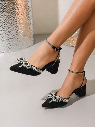 Women's Pointed Toe High Heel Shoes With Ankle Strap, Thick Heel, Black, Rhinestone & Pearl Bow Decor, Casual & Comfortable Sandals, New Fashion For Spring/Summer - Black - View 1