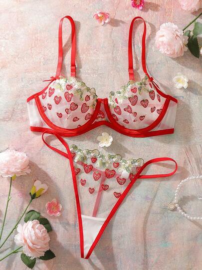 Women's Red Strawberry Embroidery Bowknot Sheer Lace Lingerie Set, Sweet & Playful, Suitable For Dates And Holidays - Multicolor - View 1