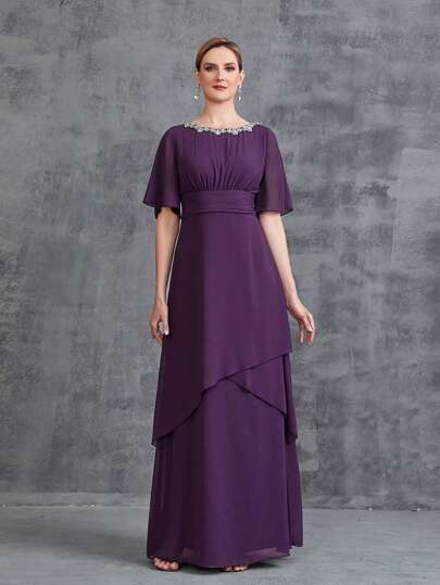 Women's Rhinestone Detail Short Sleeve Chiffon Party Dress - Purple - View 1