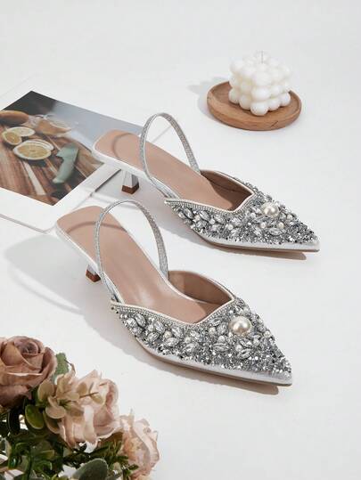 Women's Rhinestone Embellished Luxury Kitten Heel Pointed Toe Slip-On Mule Sandals, Shiny Material, Fashionable & Elegant For Party And Formal Wear - Silver - View 1