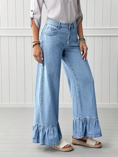 Women's Ruffle Hem Wide Leg Jeans - Light Wash - View 5