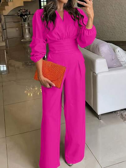 Women's Shirred Jumpsuit With Pockets - Hot Pink - View 1