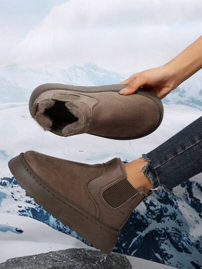 Women's Snow Boots,Women's outdoor warm thick-soled snow boots, solid color brown round toe Chelsea winter suede snow boots - Brown - View 1