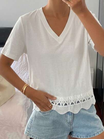 Áo nữ mùa hè dáng suông cổ tròn tay ngắn phối ren, màu trơn, kiểu dáng thường ngày.