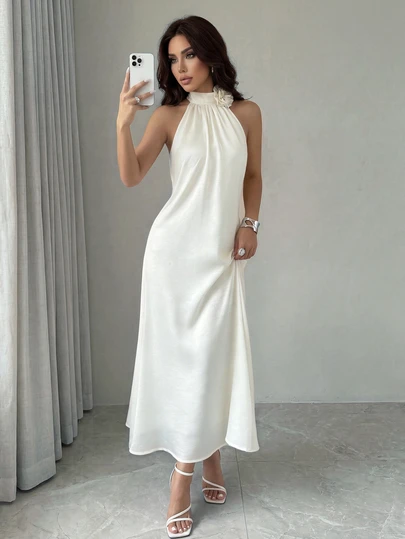 Women's Solid Color Detachable 3D Floral Decor Casual Dress, Women's Floral 3D Dress, White Dress, New Year White Dress - White - View 1