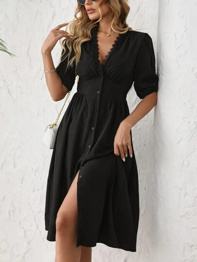 Women's Solid Color Front Button Placket Simple Casual Dress - Black - View 1