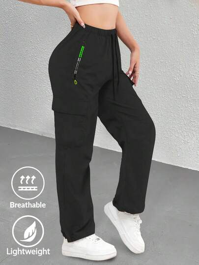 Women's Straight Leg Workout Pants, Casual Lightweight Breathable Pants With Contrast Zipper Pockets, Versatile For Multiple Occasions - Black - View 1
