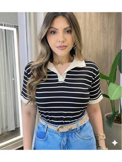 6. Women's Striped Polo Shirt, Basic Work/Everyday T-Shirt, Viscose/Knit Fabric, Short Sleeves.