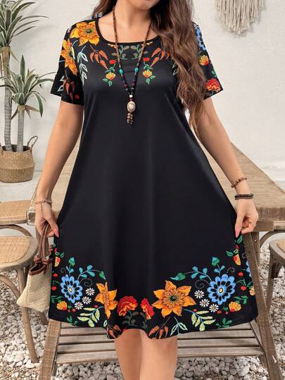 EMERY ROSE Plus Size Women Floral Print Patchwork Round Neck Short Sleeve Casual A-Line Mini Dress For Summer - Black - View 1