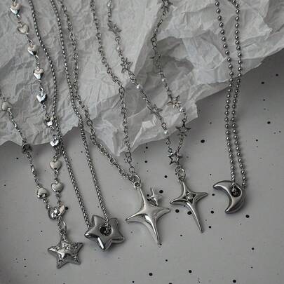 Y2K Mangxing Moon Pendant Necklace Set, Personalized Inlaid Rhinestone Star Love Snake Bone Stainless Steel Thick Chain Chain Necklace, Suitable For Wome - Silver - View 1