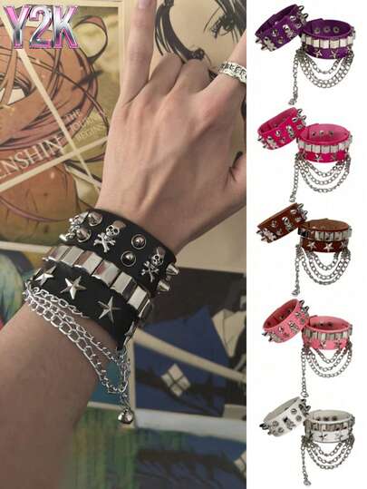Y2K PU Leather Studded Bracelet, Unique Skull Street Dance Bracelet Accessory, Hip-Hop Bracelet, Jewelry, Party Bracelet, Holiday Gift. - Multicolor - View 1