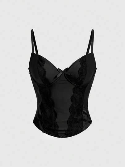 ROMWE Goth Y2K Sexy Contrast Lace Spaghetti Strap Top With Rope Tie Waist Decor, Suitable For New Year Party - Black - View 1