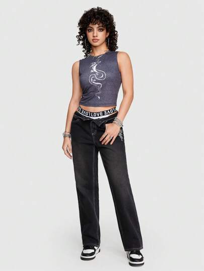 ROMWE Street Life Y2k Sexy Dragon Pattern Jean-Like Knitted Fabric Tank Top For Summer For Women - Navy Blue - View 1