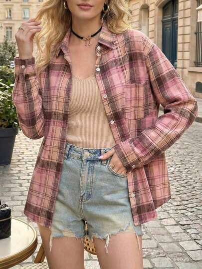 YUXIN Pink Plaid Women Long Sleeve Loose Casual Shirt Top With Pockets, Spring/Summer - Pink - View 1
