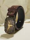 1pc Men's Retro Bull Head Buckle Belt, Classic Engraved PU Leather Fashion Accessory, Western Style Casual Wear